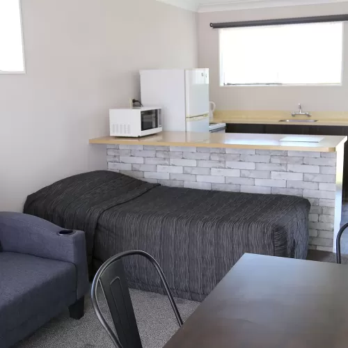 Nine units are studios, with various bed configurations. They have either king or queen beds as well as single in some. All have microwaves, toasters, jugs, fridges, sinks, china and cutlery. Four also have hobs. Three of these are wheelchair access units.